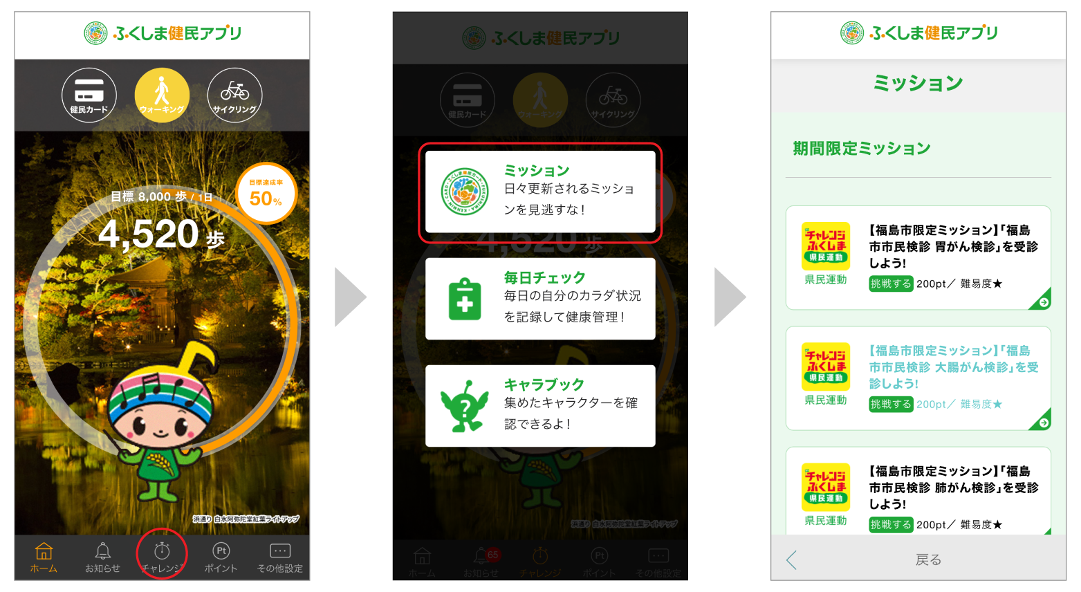 期間内に6,000歩を3日間歩くとミッションクリア!ふくしま健民アプリポイントが200ポイント獲得できます。
