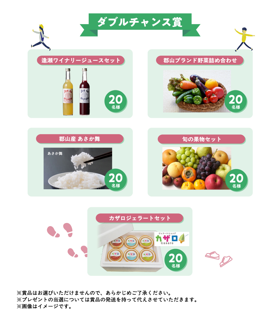 ■内容 期間中に1日6,000歩を合計3日間歩くと、ふくしま健民アプリポイント200ポイントをプレゼント。また、ダブルチャンス賞として、ミッションを達成した応募者の中から抽選で100名様に郡山市・こおりやま広域圏の特産品をプレゼント。